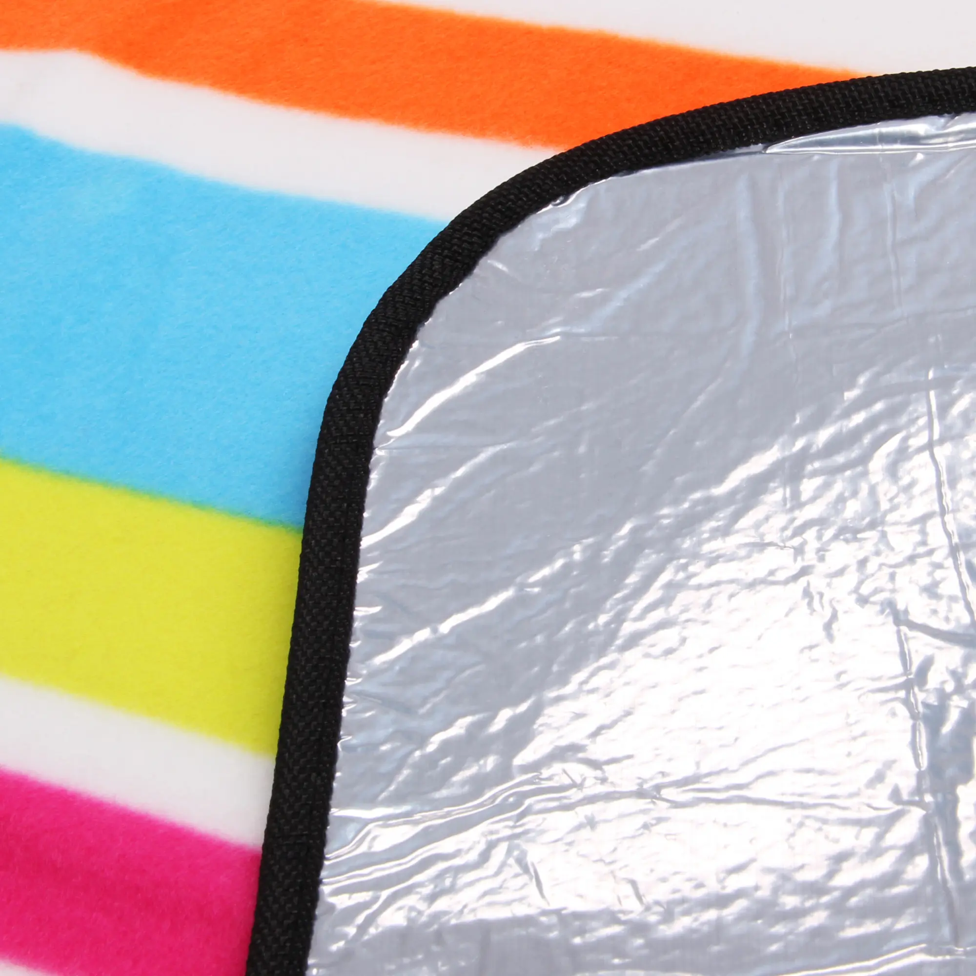 Die Unterseite der Picknickdecke bildet eine dünne Aluminiumschicht. Diese Schicht ist absolut wasserdicht und schützt die Decke von unten gegen Feuchtigkeit und Nässe. Somit sind feuchtes Gras oder nasser Sand kein Problem.